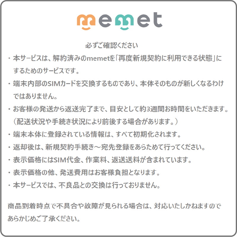 ・ 本サービスは、解約済みのmemetを「再度新規契約に利用できる状態」にするためのサービスです。・ 端末内部のSIMカードを交換するものであり、本体そのものが新しくなるわけではありません。・ お客様からの発送から返送完了まで、目安として約3週間お時間をいただきます。(配送状況や手続き状況により前後する場合があります。)・ 端末本体に登録されている情報は、すべて初期化されます。・ 返却後は、新規契約手続き~宛先登録をあらためて行ってください。
