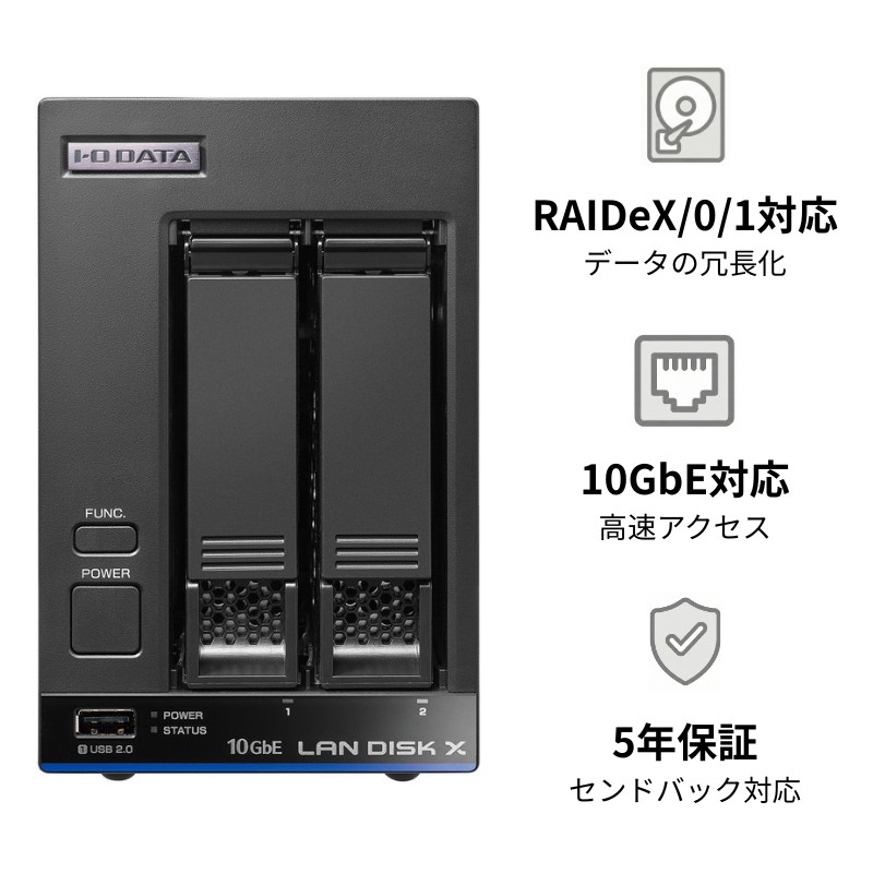 同容量のHDDを2台搭載し、データを二重化することで冗長性を担保する「RAIDeX」(レイドエックス)に対応しており、万が一片方のHDDが故障した場合でも、運用を止めずに交換することができます(※このため、実際にデータ領域として使える容量は、製品容量の2分の1となります。他、RAID 0/1にも対応)。その他、