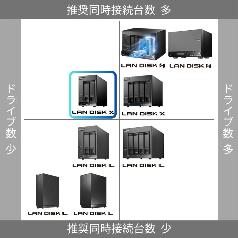 こちらのLAN DISK X(2ドライブモデル)は、LinuxベースのOSを搭載した法人向けNASの中で、非常にコストパフォーマンスに優れたミドルハイモデルです。とにかく機能が豊富で、CPUスペックも高めでありながら、手ごろな価格を実現していますので、「迷ったらとりあえずこれ!」と言っても過言ではありません。