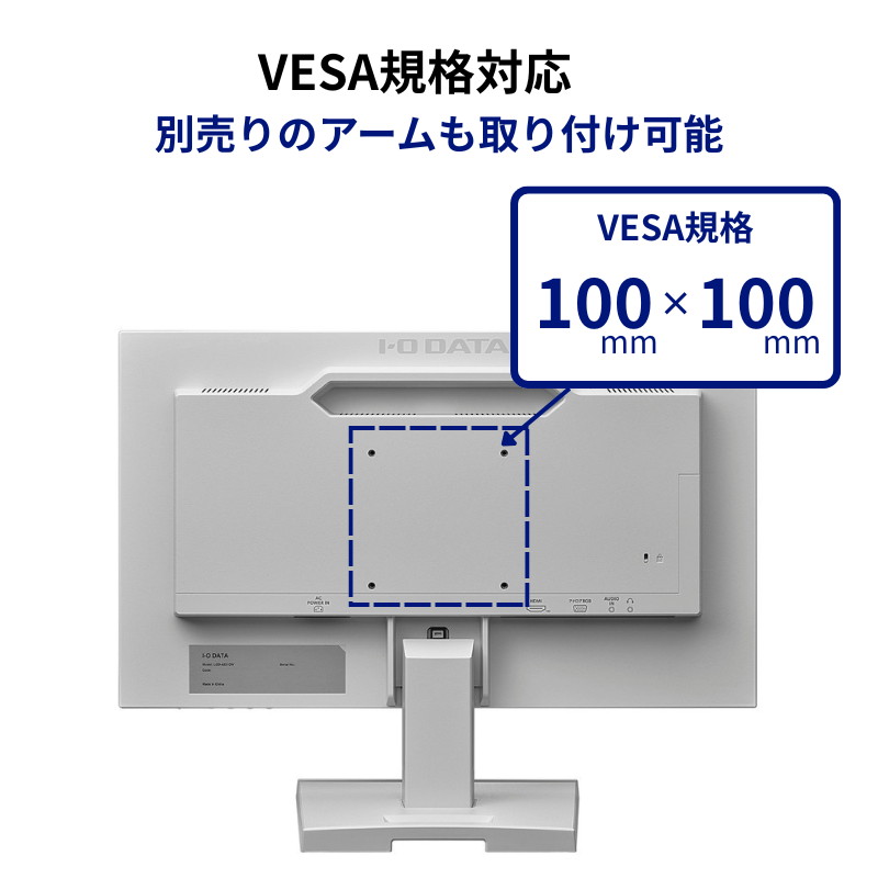 また、付属のスタンドを使えば、モニターの角度を上下に調節可能ですし、VESA規格にも対応しているので、別売りのモニターアームを取り付けて、モニターの角度や位置を自由に調節して使うこともできます。