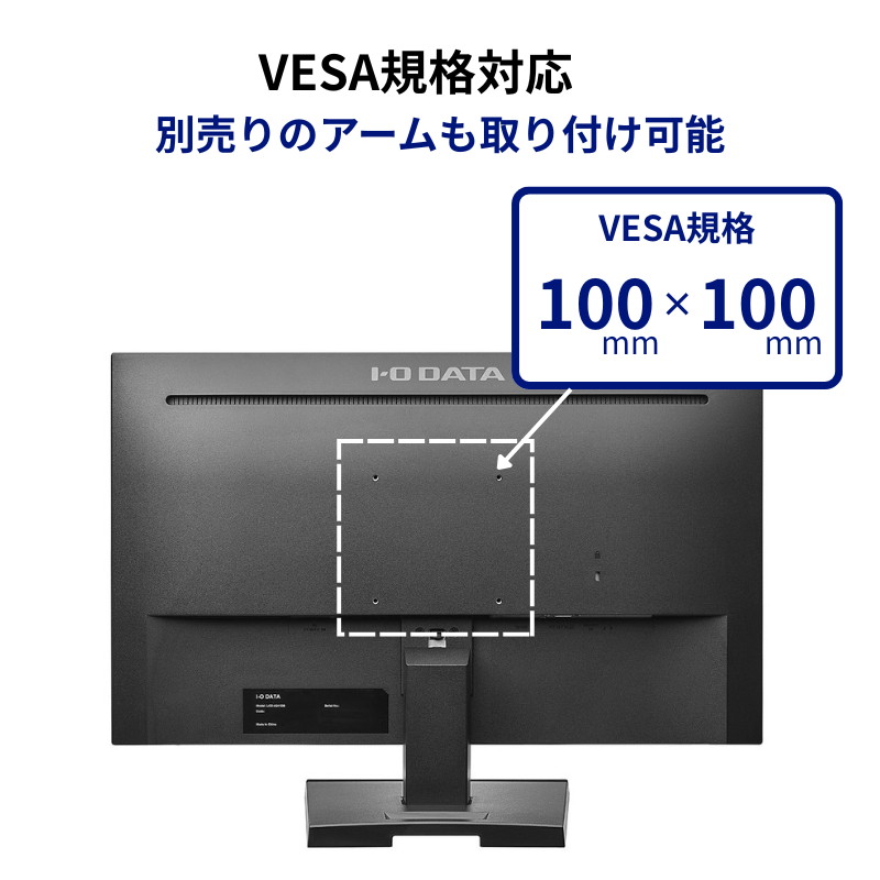 また、付属のスタンドを使えば、モニターの角度を上下に調節可能ですし、VESA規格にも対応しているので、別売りのモニターアームを取り付けて、モニターの角度や位置を自由に調節して使うこともできます。