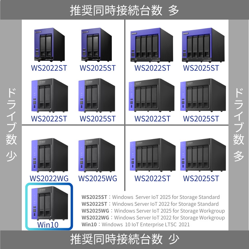 高速LAN規格10GbEにも対応しており、推奨同時接続台数20台までの小規模ファイルサーバーとして、あるいは各種データ分析やログ収集、監視カメラ映像の蓄積などのアプライアンス端末としても使えます。利用の際、高額なCALも要りません。容量ラインアップは4TBと2TB。