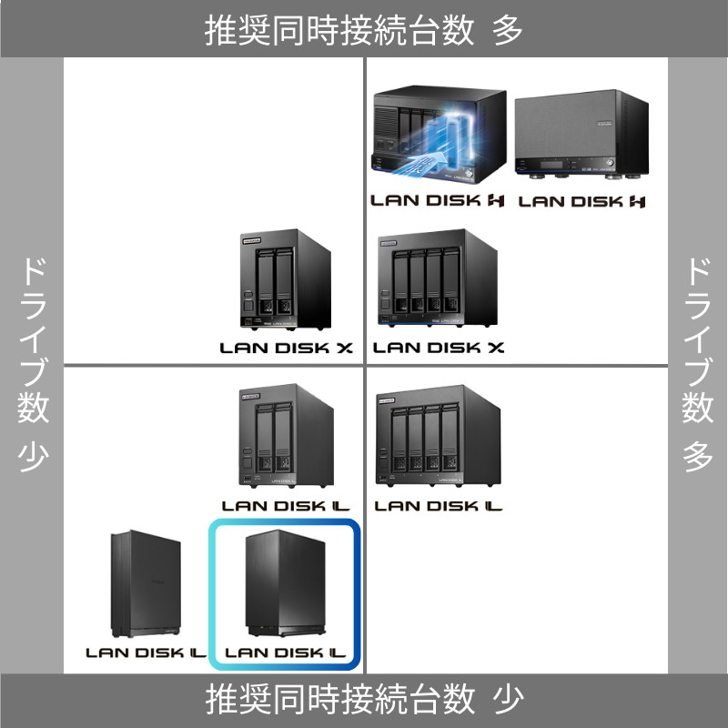 小規模オフィス・チームの共有ファイルサーバー(みんなで使えるデータ領域)としては、必要十分な仕様・性能です。新規導入はもちろん、過去の当社製NAS、LAN DISK Aシリーズなどのエントリーモデルをお使いの方の買い替え機種としてもオススメできます。