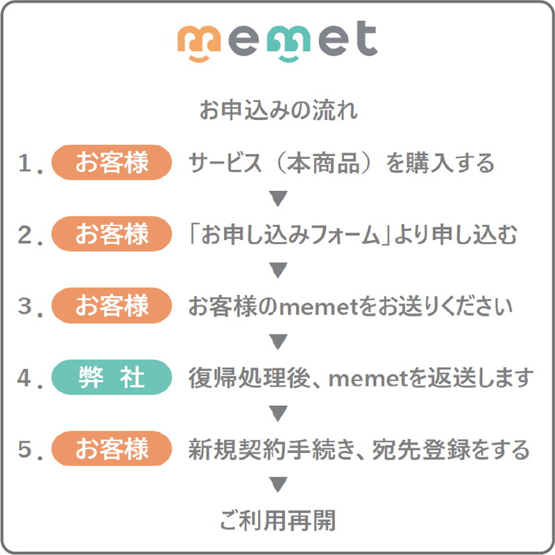 ・ 本サービスは、解約済みのmemetを「再度新規契約に利用できる状態」にするためのサービスです。・ 端末内部のSIMカードを交換するものであり、本体そのものが新しくなるわけではありません。・ お客様からの発送から返送完了まで、目安として約3週間お時間をいただきます。(配送状況や手続き状況により前後する場合があります。)・ 端末本体に登録されている情報は、すべて初期化されます。・ 返却後は、新規契約手続き~宛先登録をあらためて行ってください。