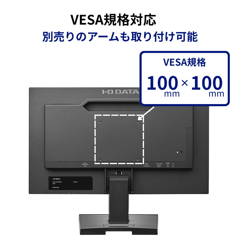 また、付属のスタンドを使えば、モニターの角度を上下に調節可能ですし、VESA規格にも対応しているので、別売りのモニターアームを取り付けて、モニターの角度や位置を自由に調節して使うこともできます。