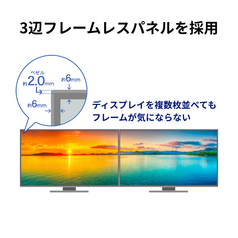 といったような使い方が可能です。本商品は、2台横に並べても継ぎ目が気になりにくい「3辺フレームレス」設計(※18.5インチのみ未対応)ですし、1台あたりの価格もお手頃ですので、1枚使いはもちろん、2枚目のモニターとしても大変オススメです!