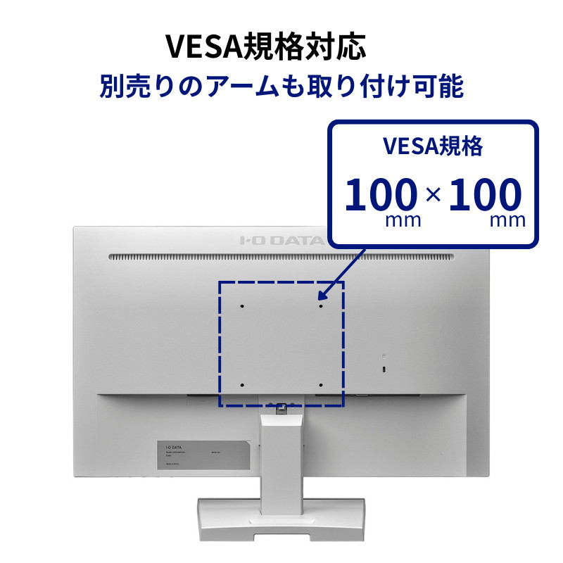 また、付属のスタンドを使えば、モニターの角度を上下に調節可能ですし、VESA規格にも対応しているので、別売りのモニターアームを取り付けて、モニターの角度や位置を自由に調節して使うこともできます。